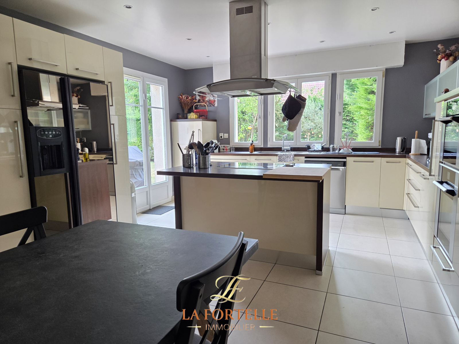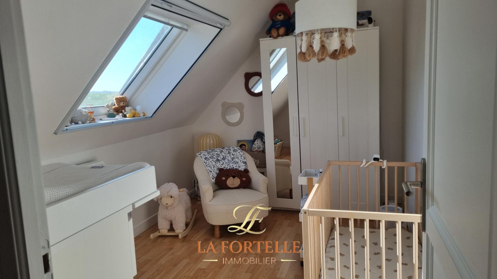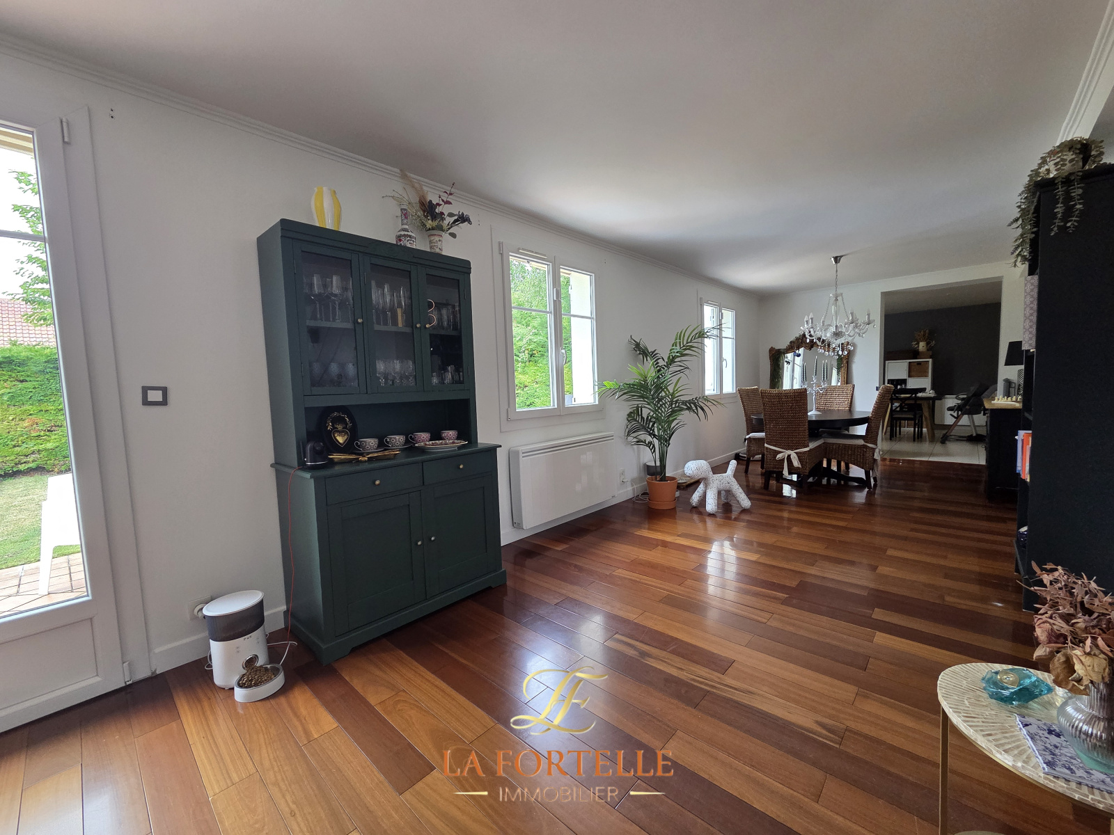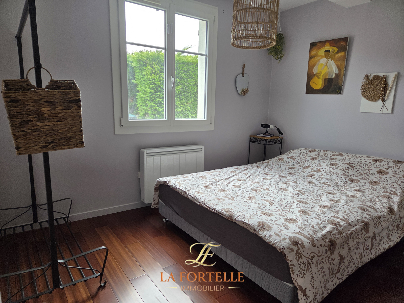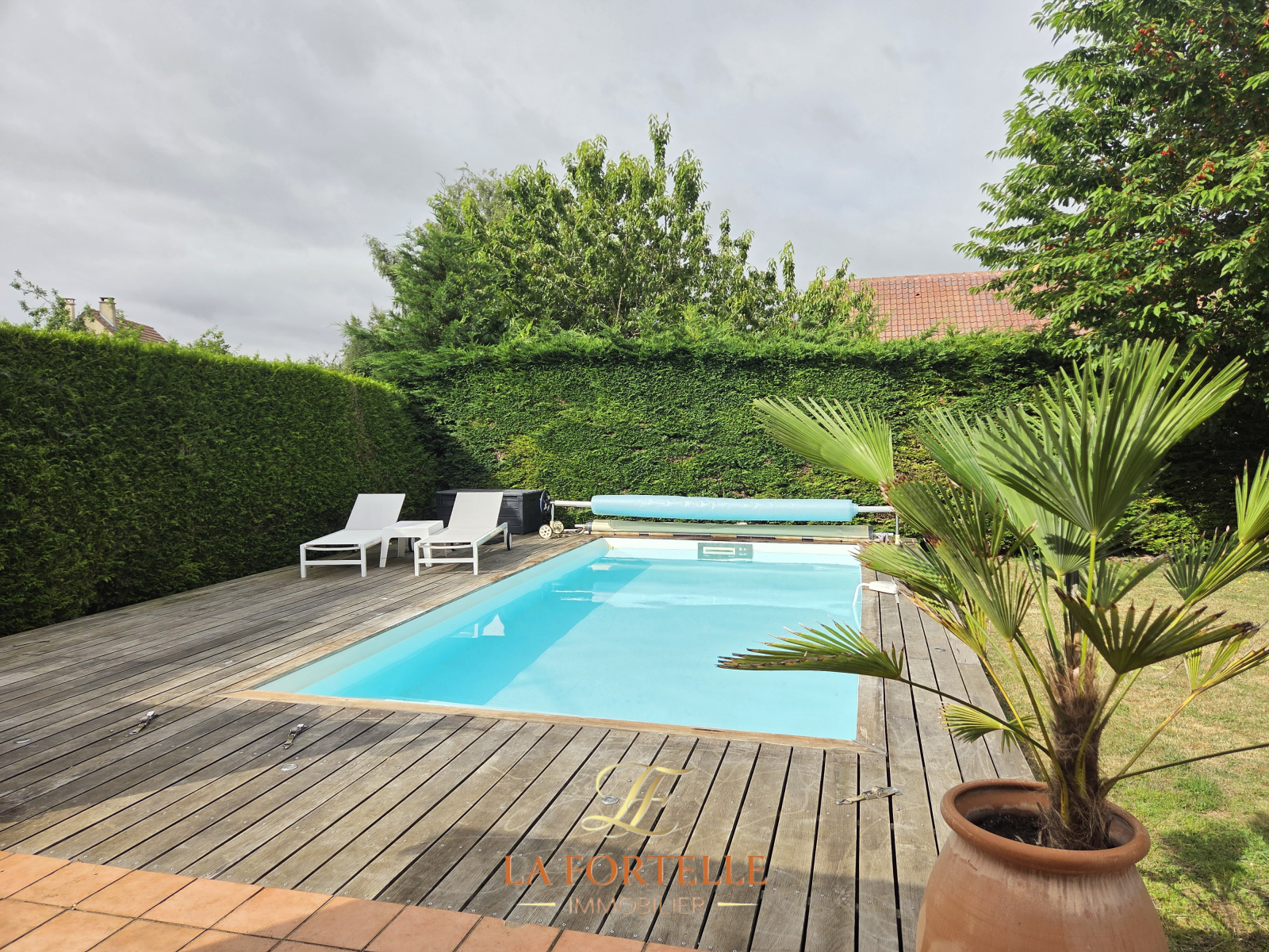 Jardin clos sans vis à vis avec piscine chauffée, terrasse et un abri de jardin. Garage et 2 places de parking intérieures.