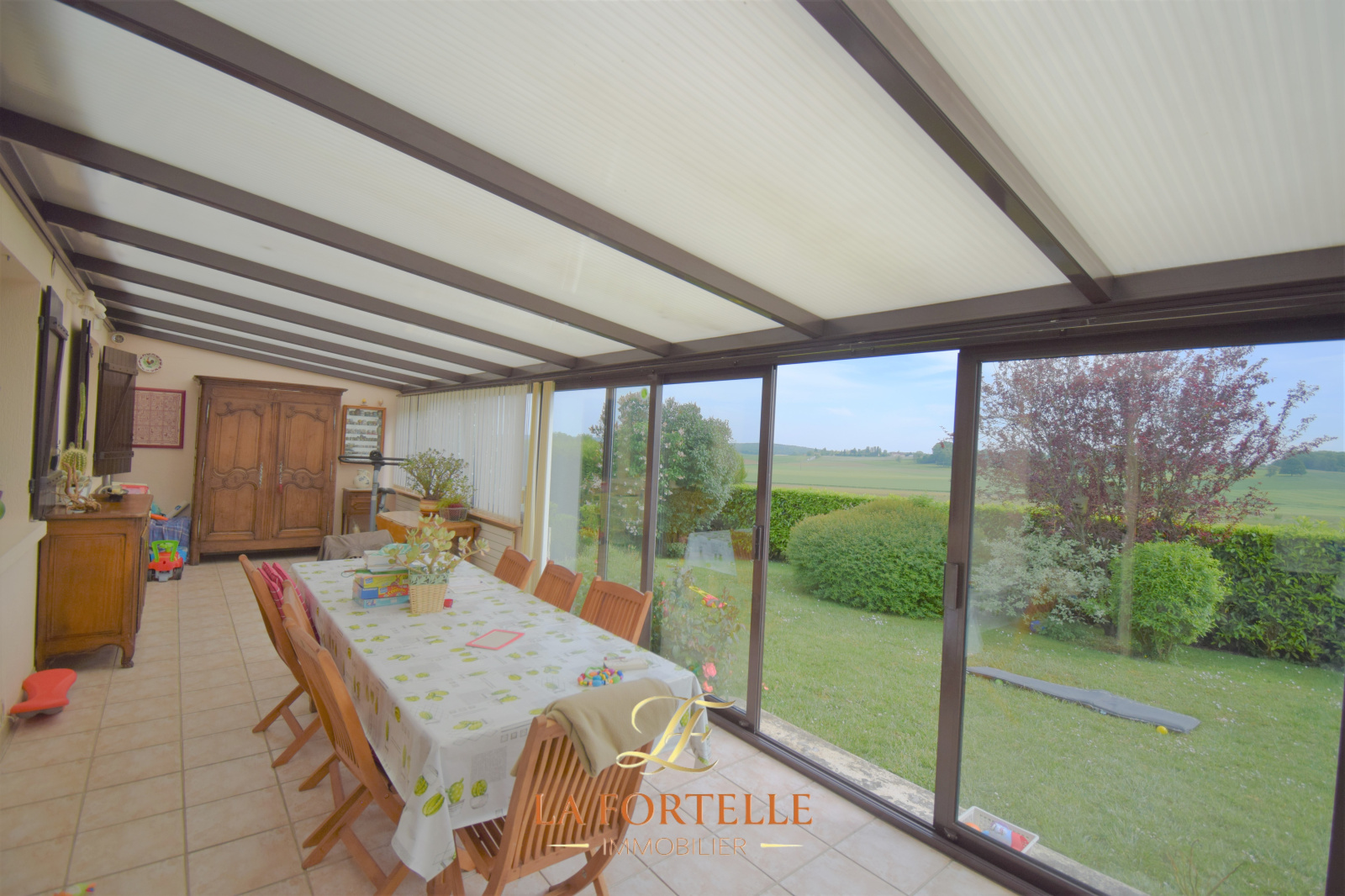 RDC : Entrée, salon-séjour avec cheminée (insert), cuisine aménagée séparée , Véranda de plus de 30 m² avec une magnifique vue sur la vallée, 2 chambres, un WC, une salle de bain.